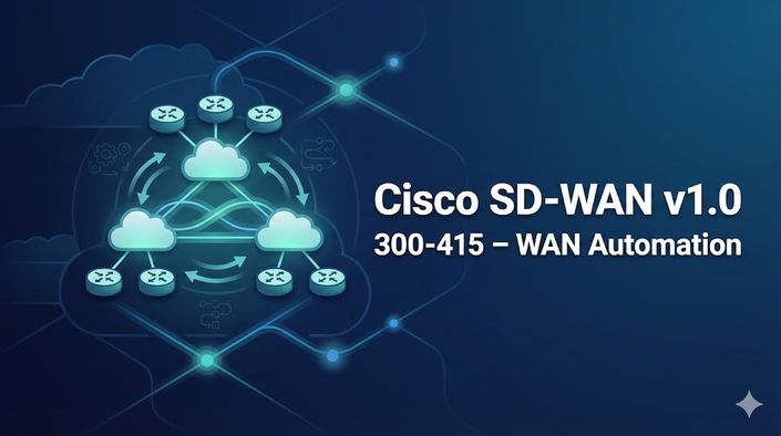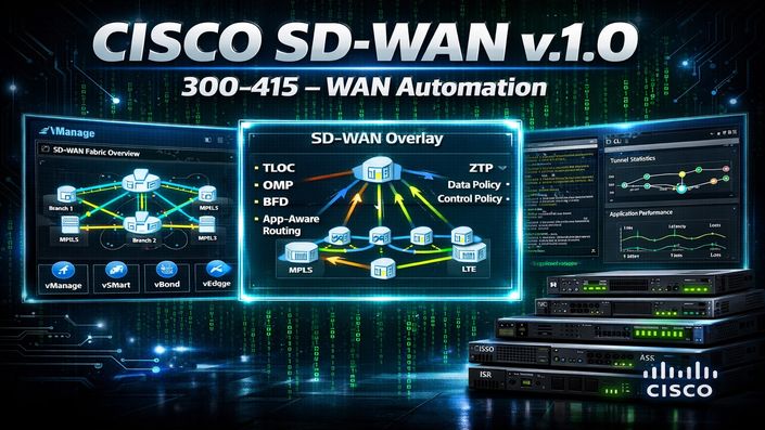 Learn Cisco SD-WAN (Viptela) architecture, deployment, and automation for the 300-415 ENSDWI exam. Cover vManage, vSmart, vBond, vEdge controllers, policies, templates, and troubleshooting. Includes hands-on labs with real SD-WAN topologies. Perfect for network engineers pursuing CCNP Enterprise specialization in WAN automation and software-defined networking.