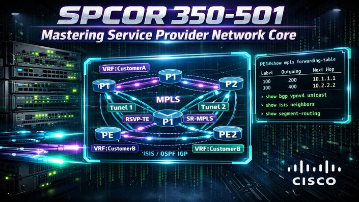 Master Cisco SPCOR 350-501 for CCNP Service Provider and CCIE SP certifications. Learn core SP technologies including MPLS, segment routing, BGP, IS-IS, multicast, QoS, and network automation. Hands-on labs with real service provider topologies and exam preparation strategies for network engineers.