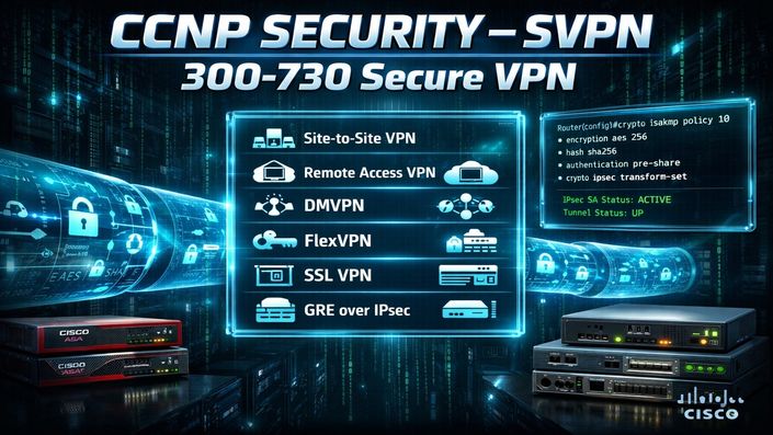 Master Cisco SVPN 300-730 for CCNP Security certification. Learn site-to-site VPN, remote access VPN, SSL VPN, FlexVPN, DMVPN, and IPsec on Cisco routers and firewalls. Hands-on labs with real-world VPN configurations and troubleshooting for enterprise security professionals.