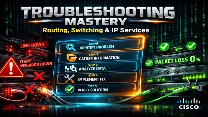 Master network troubleshooting for routing, switching, and IP services. Learn systematic approaches to diagnose OSPF, EIGRP, BGP, VLAN, STP, and IP connectivity issues. Perfect for CCNA/CCNP candidates and working network engineers who need to sharpen their diagnostic skills.